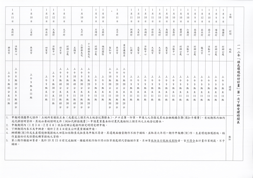 112年「綠色環境給付計畫」開始申辦了~ 112年「綠色環境給付計畫」自112年1月3日起至2月4日止開始申報,請攜帶申報人印章、戶口名簿、申報人農會存簿或其他金融機構存簿(須扣手續費)、土地所有權狀或三個月內之土地登記謄本、有效期限內租約書、代耕協議書等相關證明文件到各村下鄉服務地點或本所農業課辦理 詳情可參閱申報注意事項或洽農業課:8652301*133 陳先生