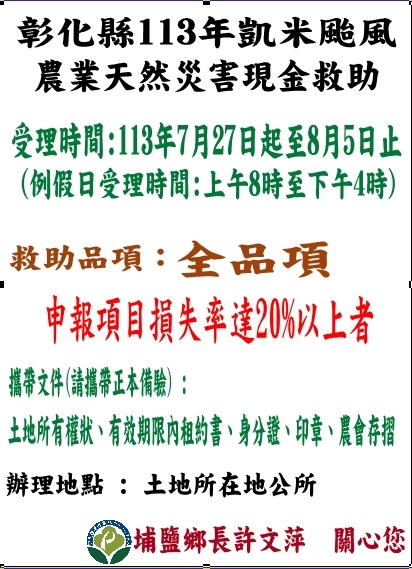 彰化縣113年凱米颱風農業天然災害現金救助及低利貸款開辦了 受理時間自113年7月27日起至8月5日止,本次現金救助品項為:全品項,申報項目損失率達20%以上者,請攜帶土地所有權狀、有效期限內租約書、身分證或戶口名簿、印章、農會存摺,至土地所在地公所辦理
